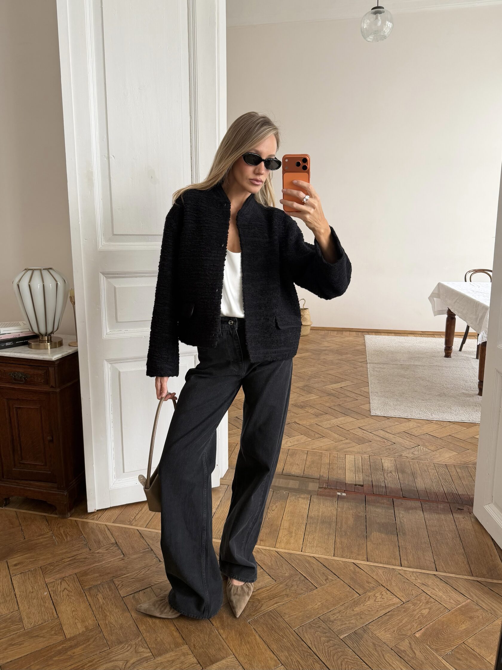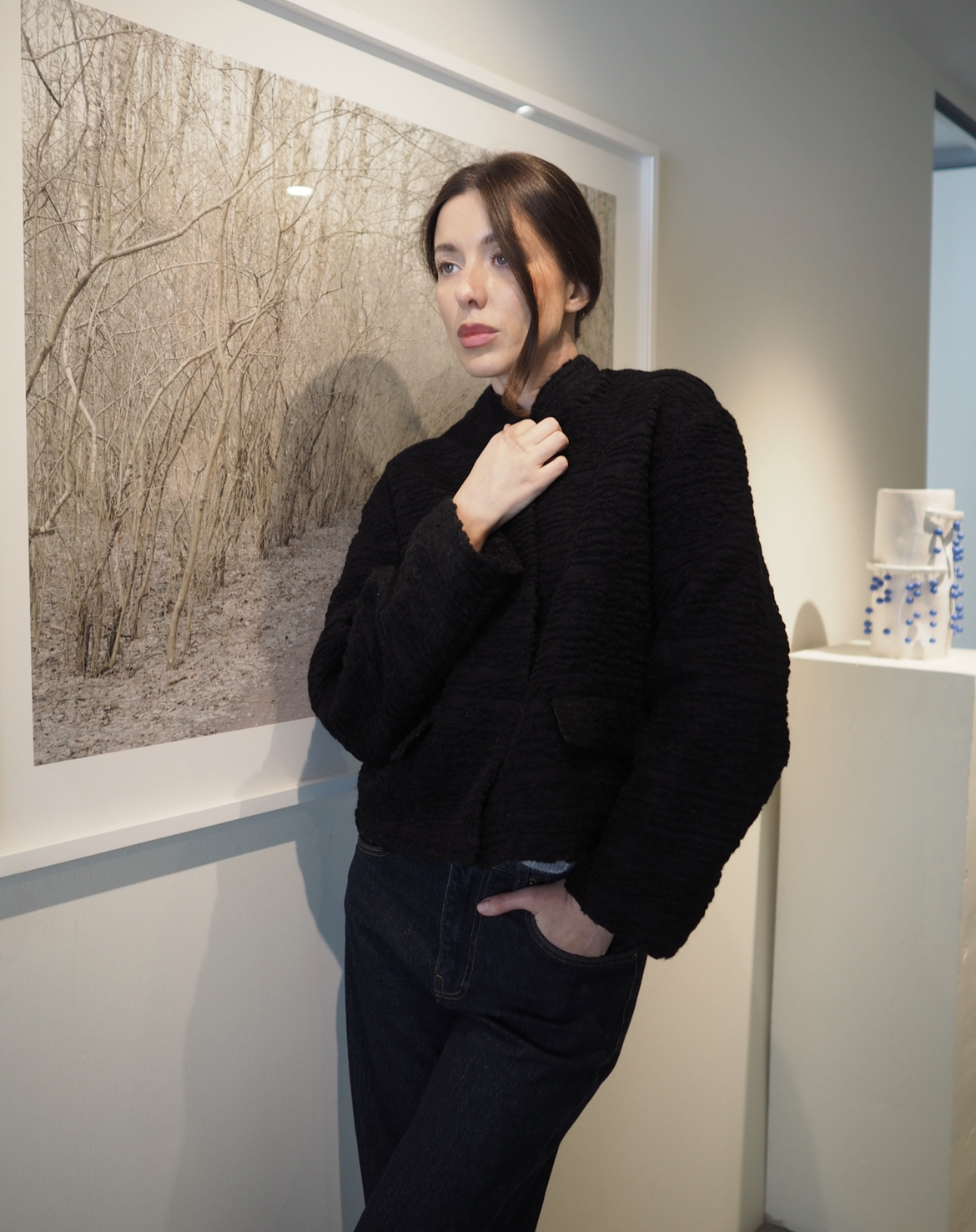 Модель выполнена из фактурной твидовой шерсти глубокого чёрного оттенка. Объёмная текстура материала придаёт поверхности мягкую выразительность и помогает форме сохранять чёткость.