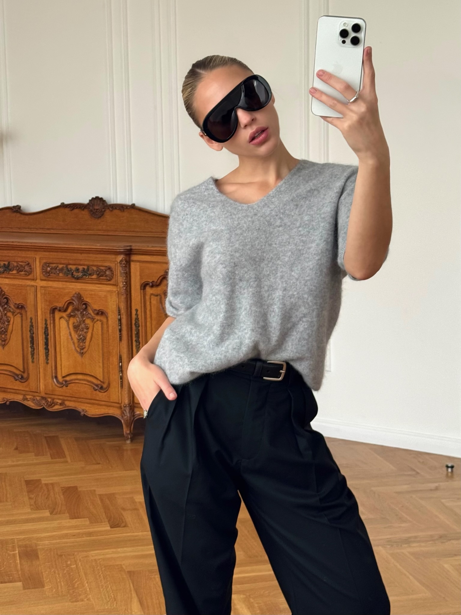 Этот джемпер из нежного кашемира в глубоких серых тонах — о минимализме и продуманной простоте. Кашемир всегда был выбором тех, кто ценит комфорт и качество: от аристократических гардеробов до минималистичных образов XX века. Его мягкое полотно бережно облегает силуэт, оставаясь лёгким и уютным. Лаконичный крой и спокойный цвет делают джемпер универсальной основой гардероба, которая естественно впишется во множество ваших осенних образов.