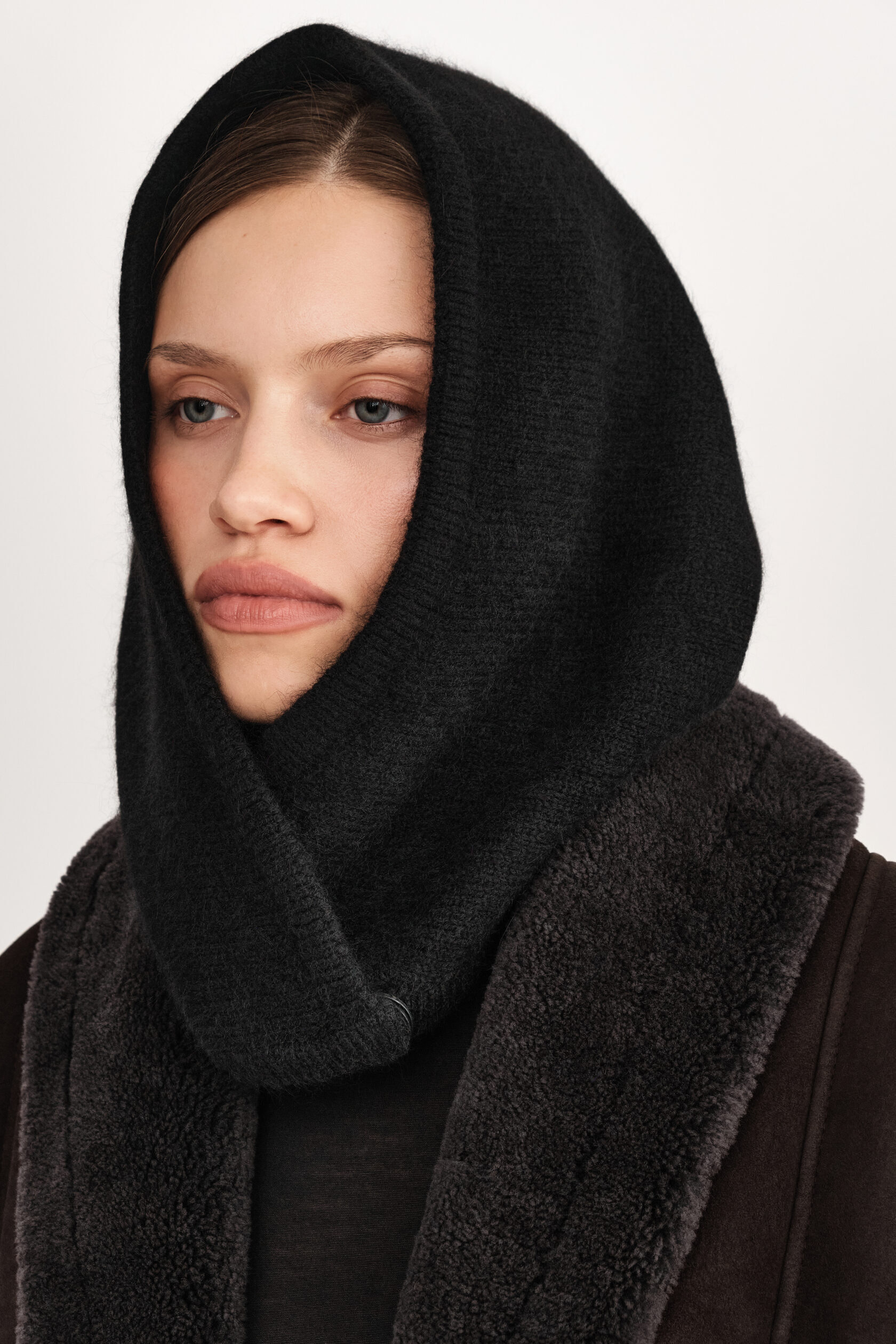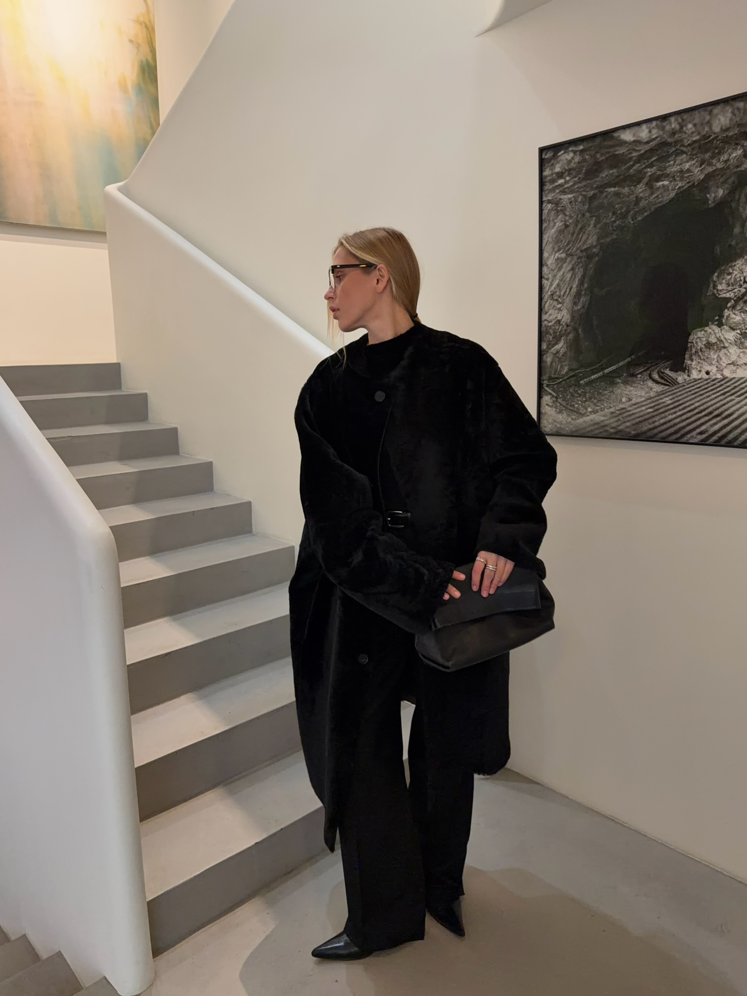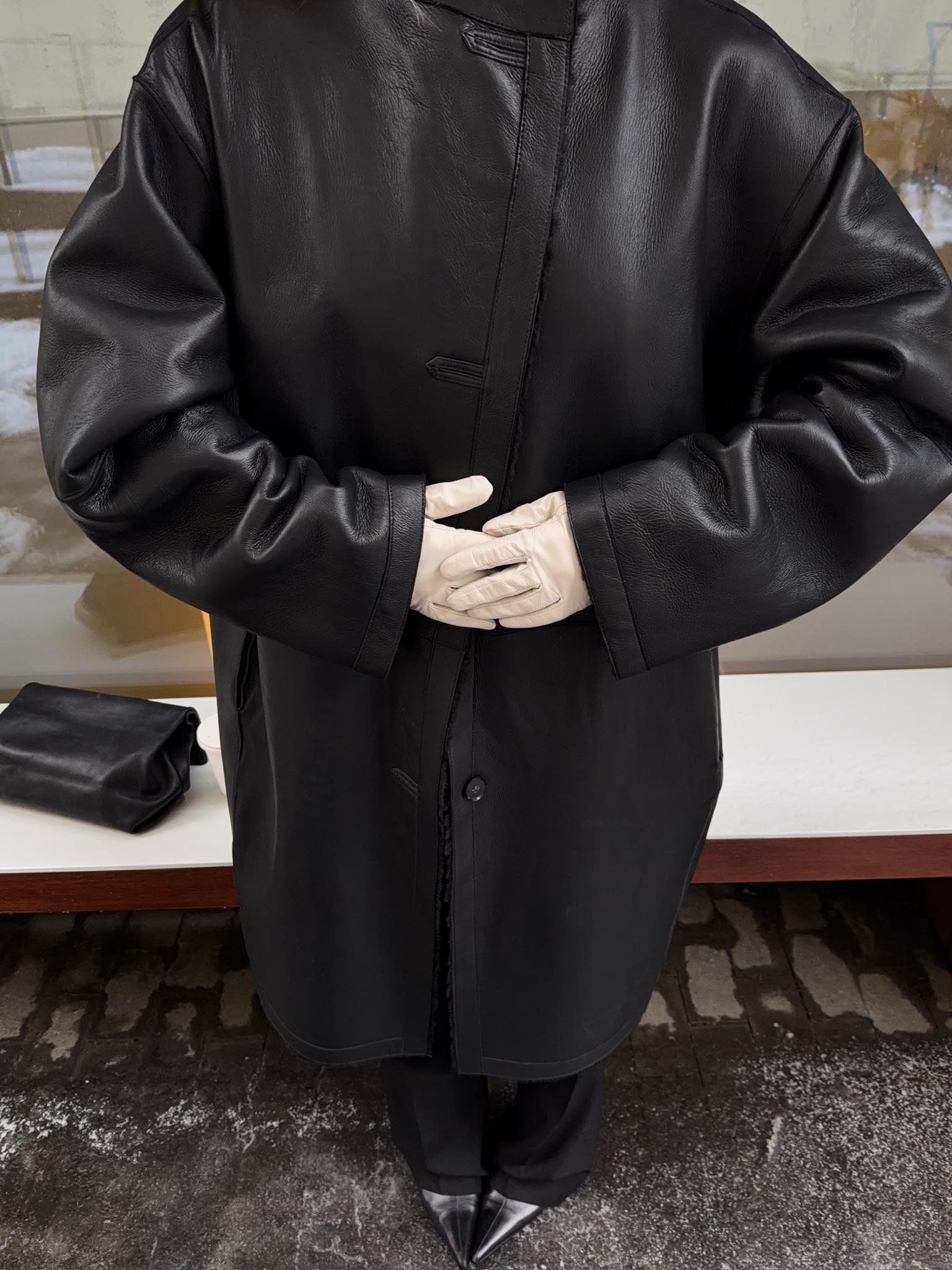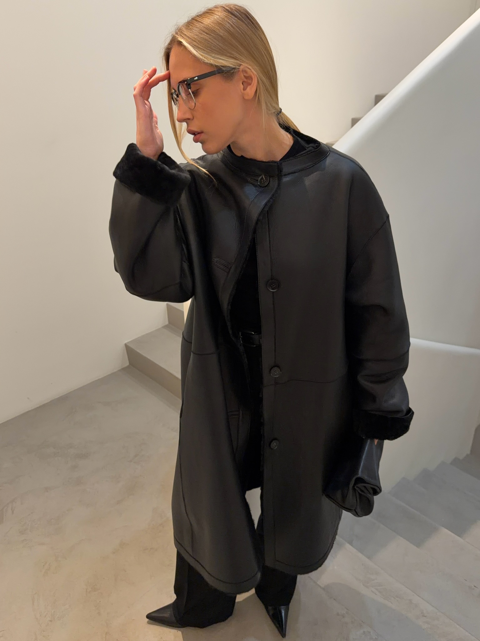 Шуба с лаконичным, почти архитектурным силуэтом и мягким объёмом. Двусторонняя модель, которая позволяет менять настроение: с одной стороны — кожаная дублёнка, по характеру напоминающая чёрный плащ в стиле 90-х; с другой — уютная, мягкая поверхность из натуральной кудрявой овчины. Без декора и лишних деталей — только линия, тепло и ощущение спокойной уверенности. Шуба органично вписывается в повседневный гардероб и красиво раскрывается в движении.