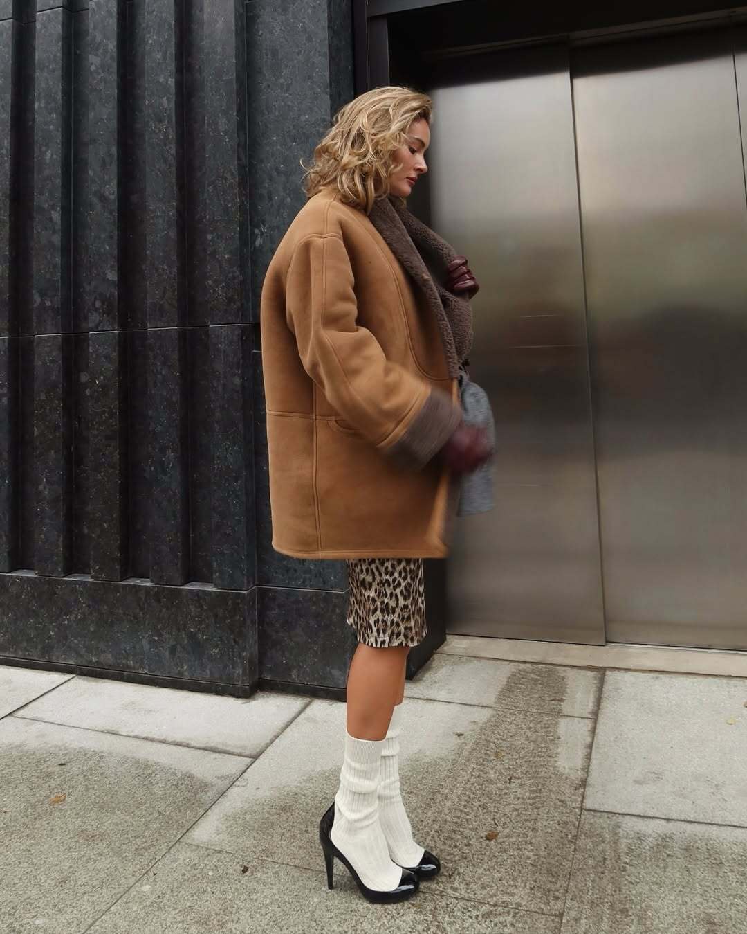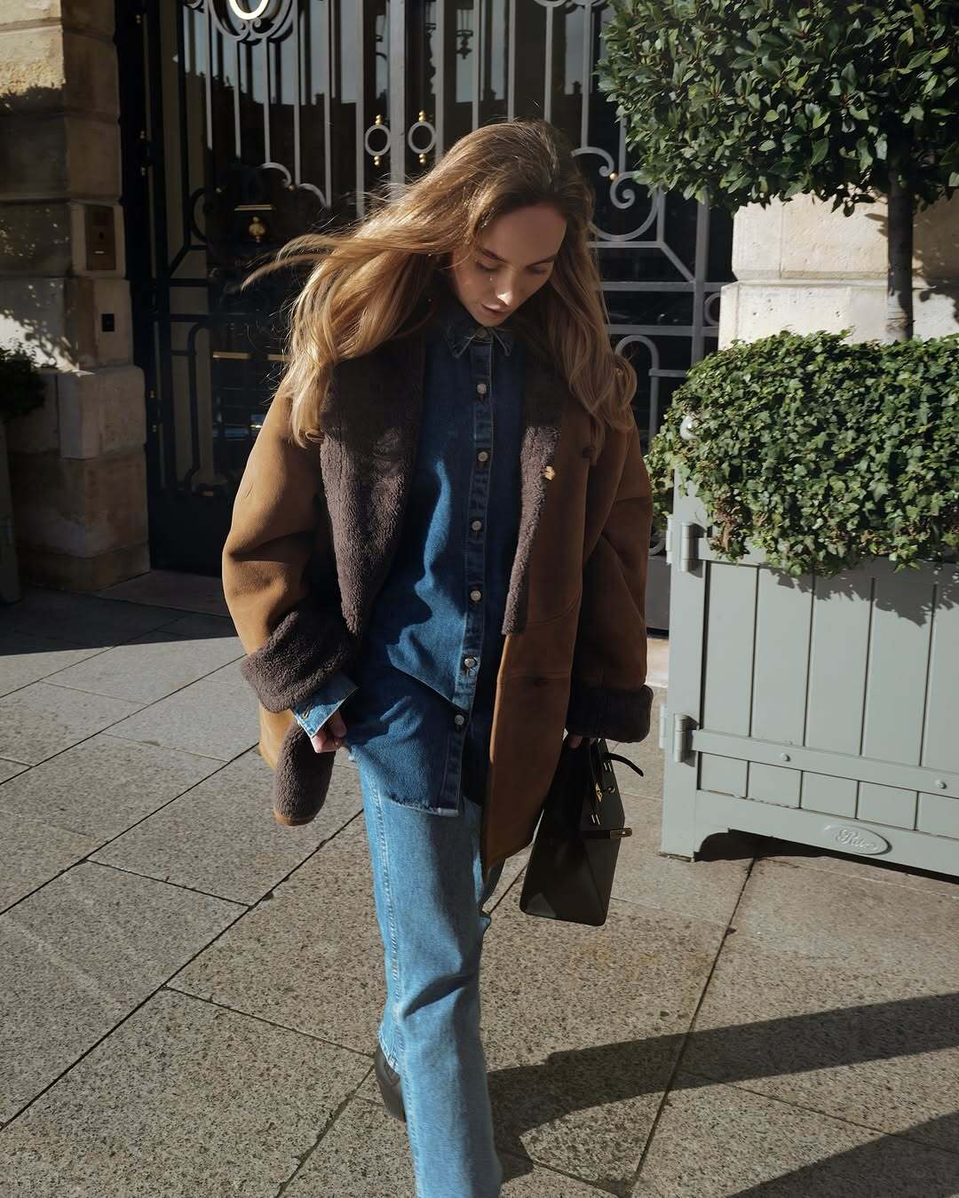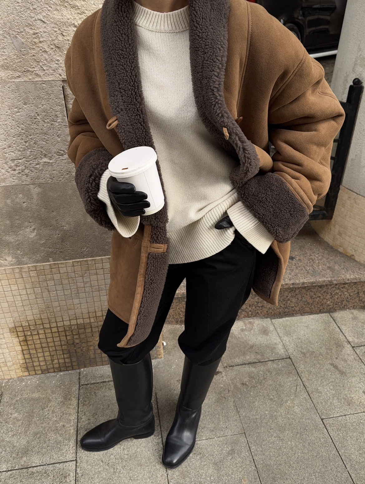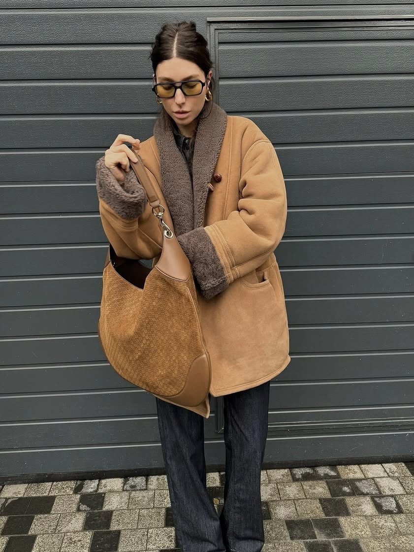 Дубленка из натуральной овчины. Благодаря удлиненному силуэту и сочетанию овчины и замши, а также оттенка, который был особенно популярен в 90’е, дубленка имеет особый ретро-шарм. Застегивается изделие на пуговицы, выполненные из натуральной кожи.