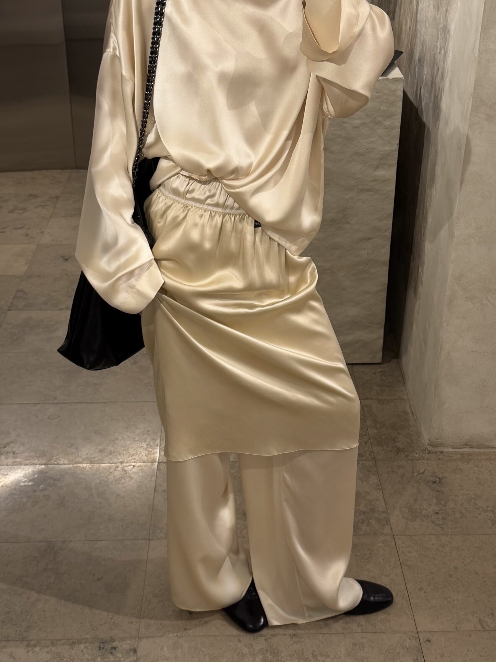 Гладкий натуральный шёлк с деликатным жемчужным оттенком и мягким благородным блеском. Материал отличается пластичностью и мягко ложится по фигуре, создавая плавный силуэт.