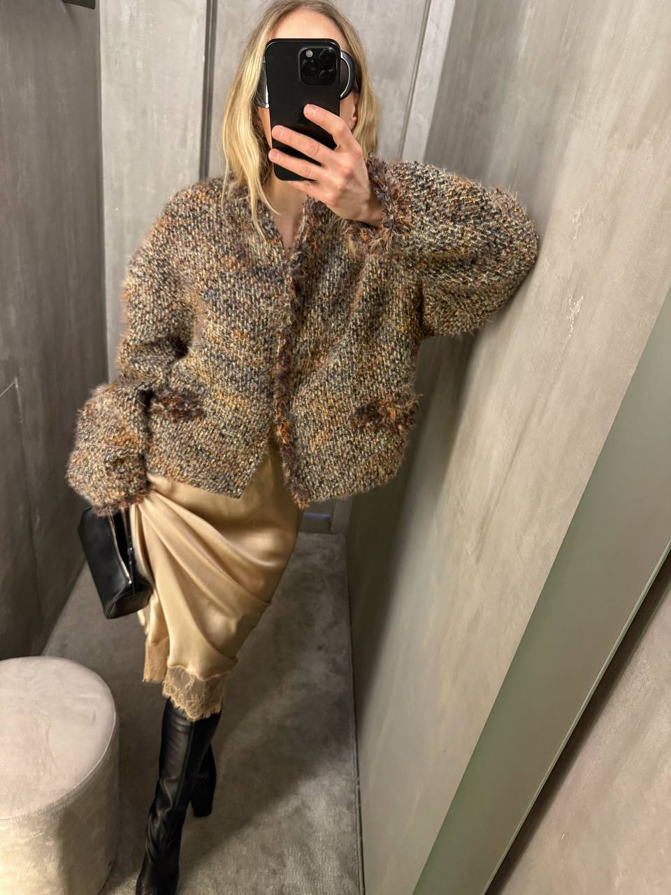 Небрежная фактура ткани и мягкая линия края добавляют образу расслабленную элегантность.