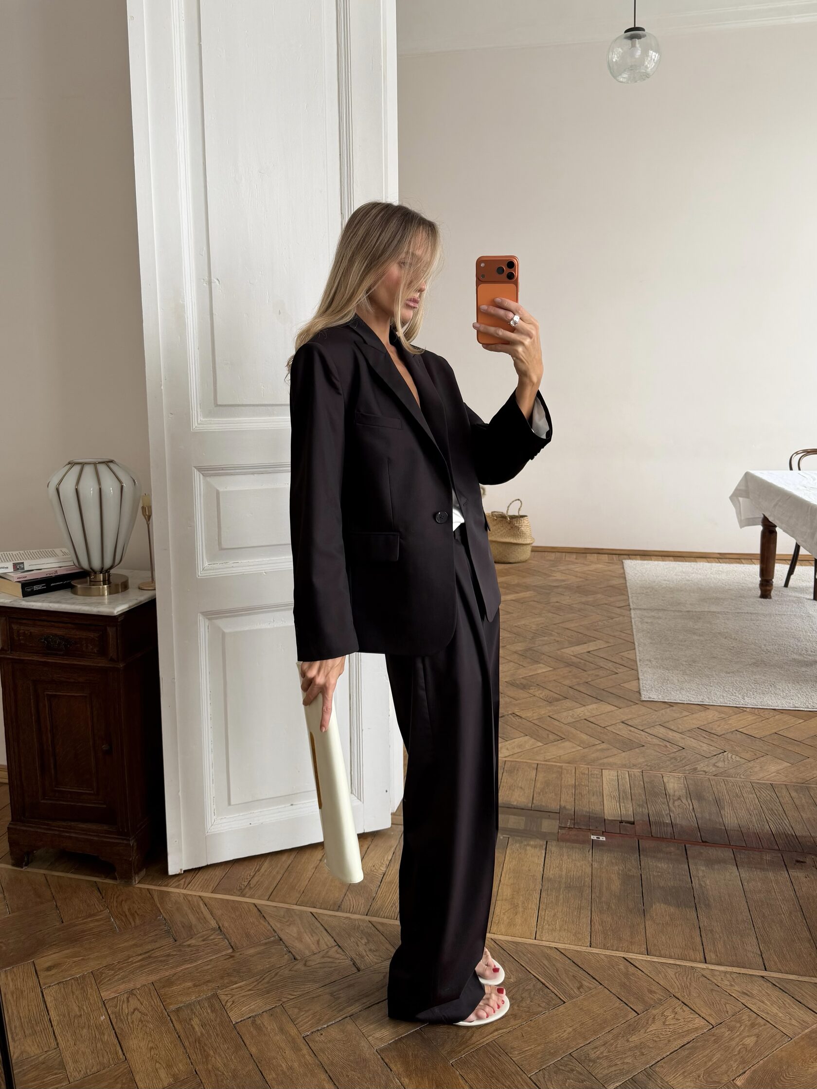 Силуэт прямой, с акцентом на плечи — словно с мужского плеча, но тонко адаптирован под женскую фигуру. Он одинаково хорошо смотрится с брюками, джинсами, юбкой или поверх платья. Внутри аффирмация: "Я остаюсь верна себе"