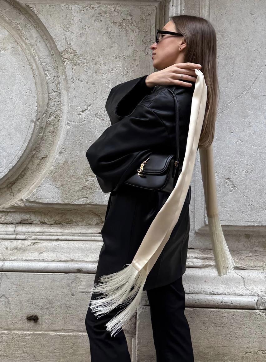 Шарф Evening Line — лёгкий аксессуар с вытянутой, текучей формой. Гладкий шёлк и длинная бахрома на концах создают мягкое движение ткани, будто линия продолжает жест и дыхание образа. Натуральный шёлк с деликатным благородным блеском красиво драпируется, мягко скользит по коже и раскрывает глубину цвета. Лёгкий, почти невесомый, этот шарф становится тем самым завершающим штрихом, который собирает образ воедино.