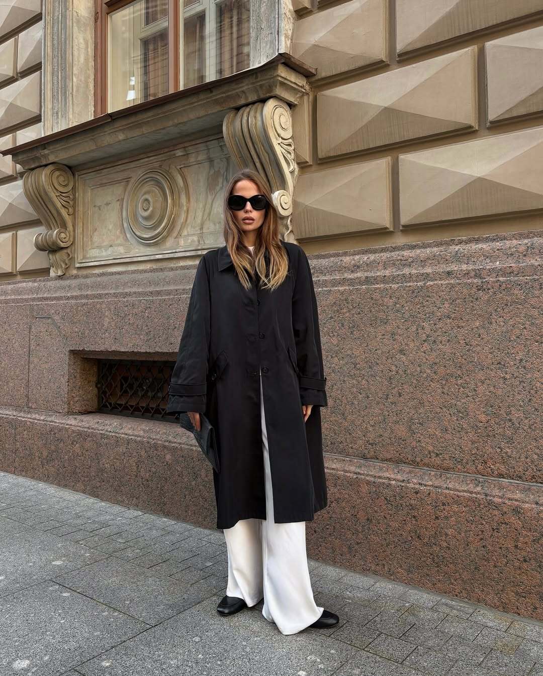 Сшитый из водоотталкивающей ткани черного цвета, он отсылает к классическому тренчу — но с обновлёнными пропорциями: прямой силуэт, чистая линия плеча, минимум деталей.