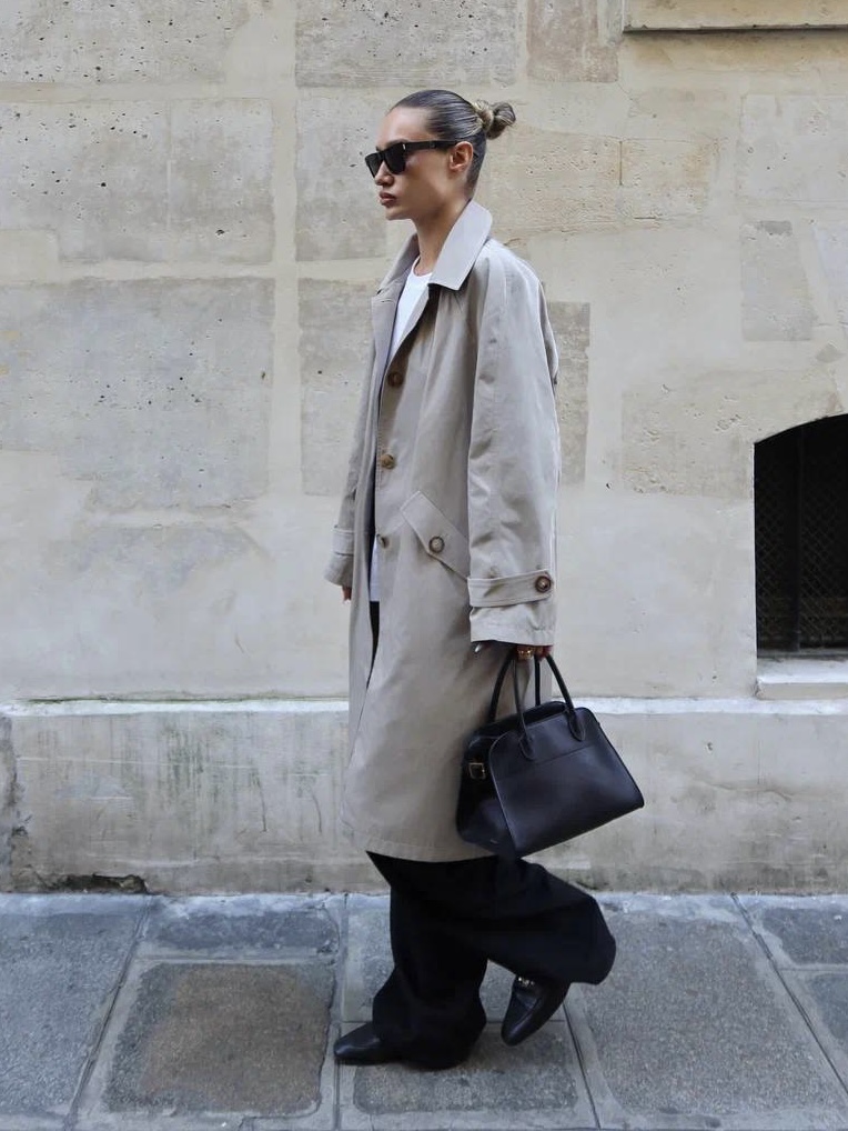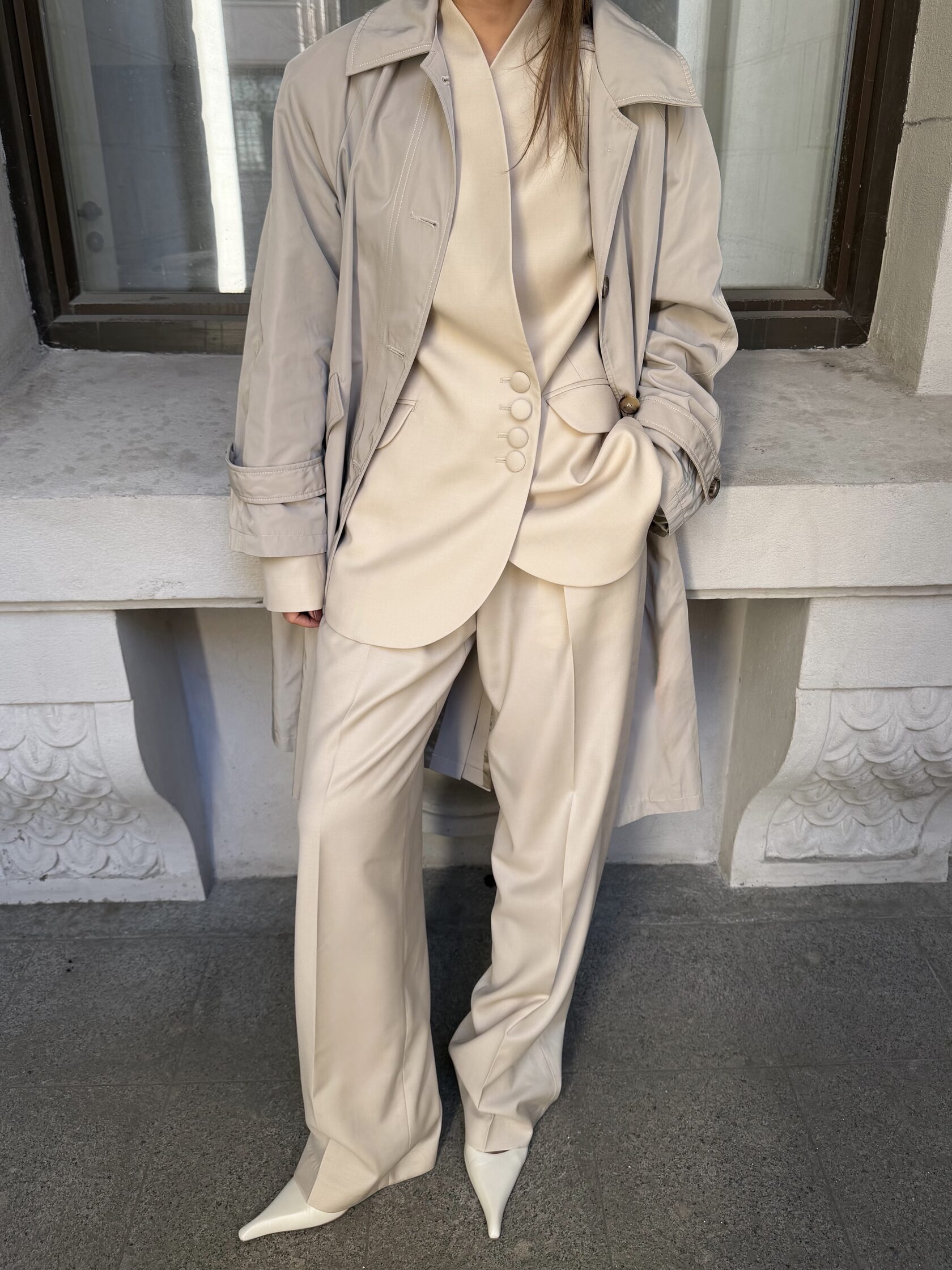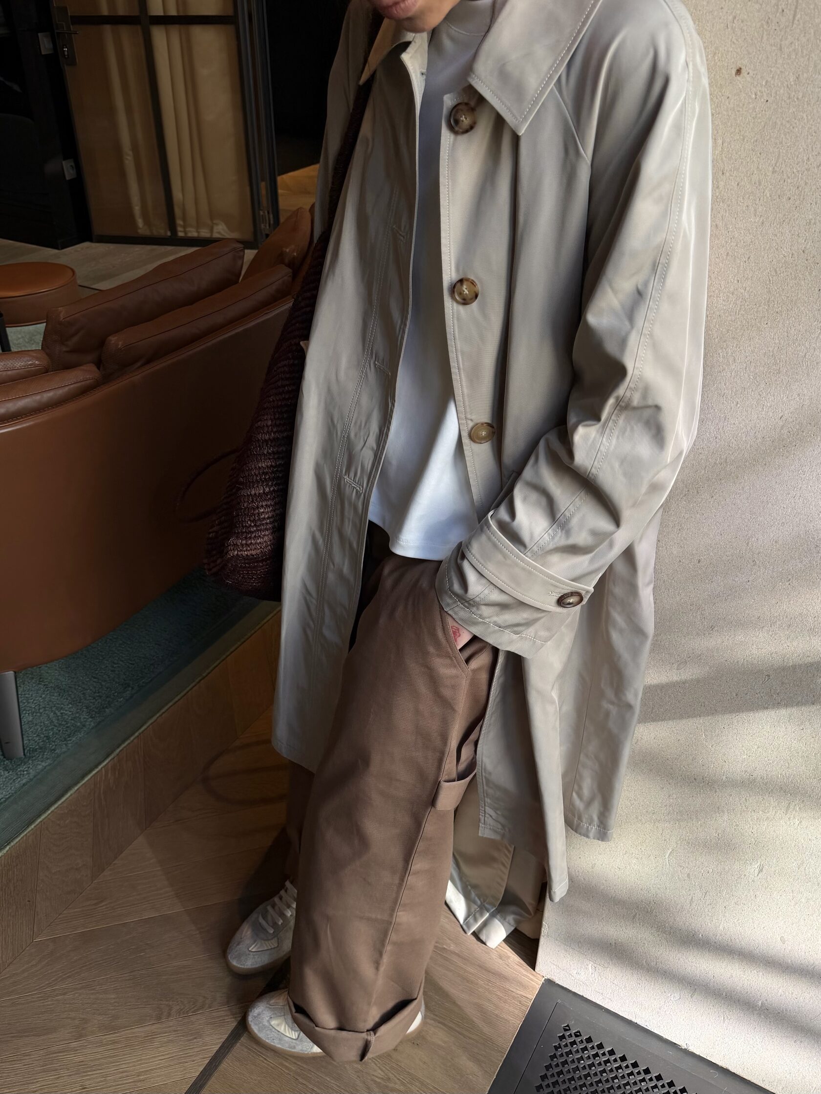 Сшитый из водоотталкивающей ткани светло-бежевого оттенка, он отсылает к классическому тренчу — но с обновлёнными пропорциями: прямой силуэт, чистая линия плеча, минимум деталей.