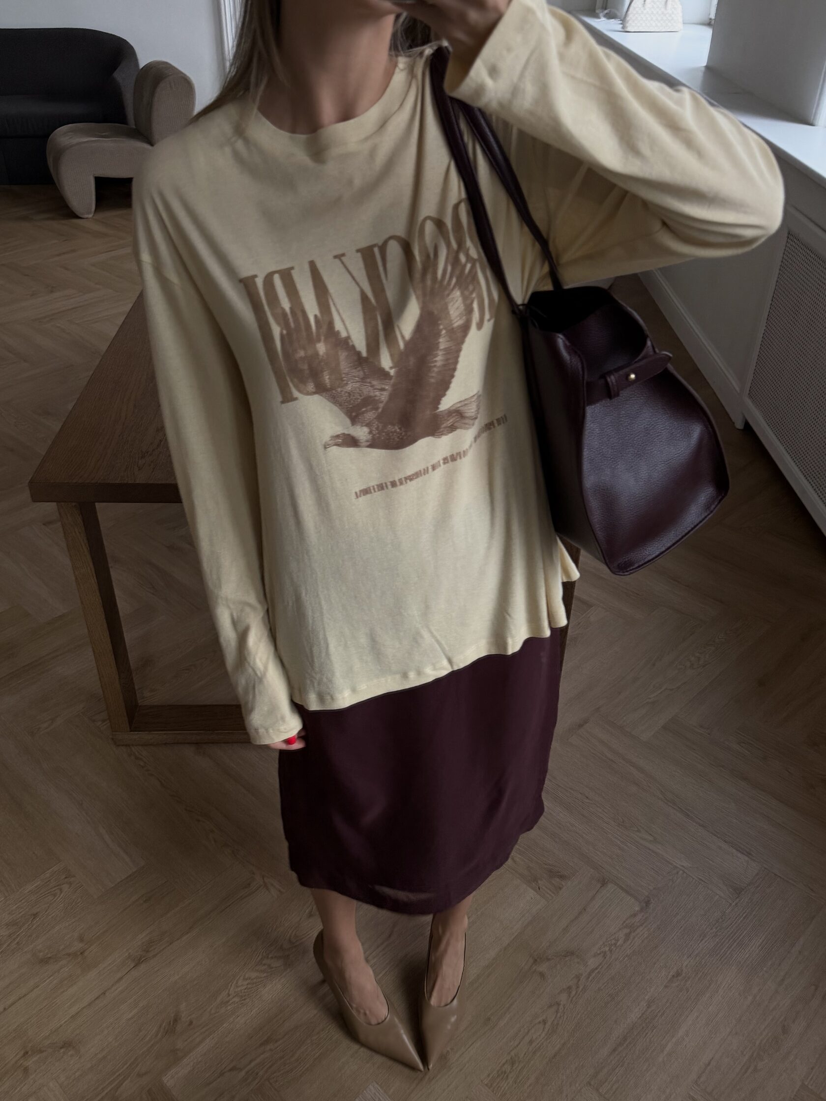 Оригинальная графика с парящим орлом и надпись “The power of the wind is the whisper of freedom” отражает философию timeless: сила — в спокойствии, свобода — внутри. Тёплый коричневый принт на молочном фоне создаёт мягкий контраст и делает лонгслив выразительным, но ненавязчивым акцентом.