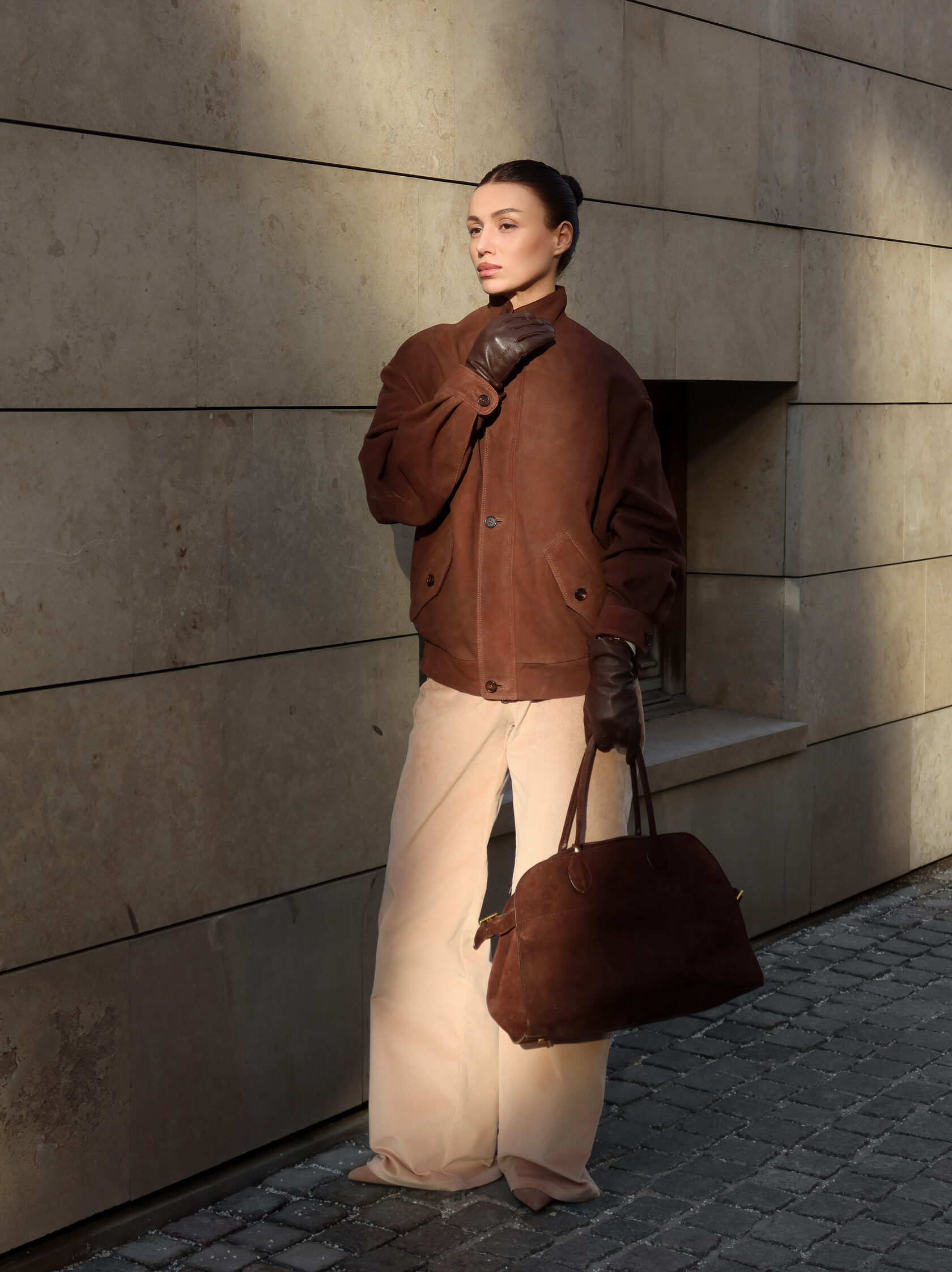Классический бомбер из премиальной бархатистой замши растительного дубления. Уникальный оттенок, разработанный специально для этой модели, напоминает благородный цвет губной помады — глубокий, насыщенный и всегда актуальный. Замша без ворса, выбранная для бомбера, мягкая словно шелк, но при этом сохраняет форму и плотность. Шоколадный подклад, брендированная тесьма — каждая деталь звучит в унисон, завершая образ в едином настроении.