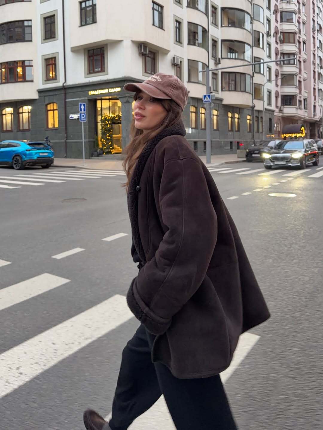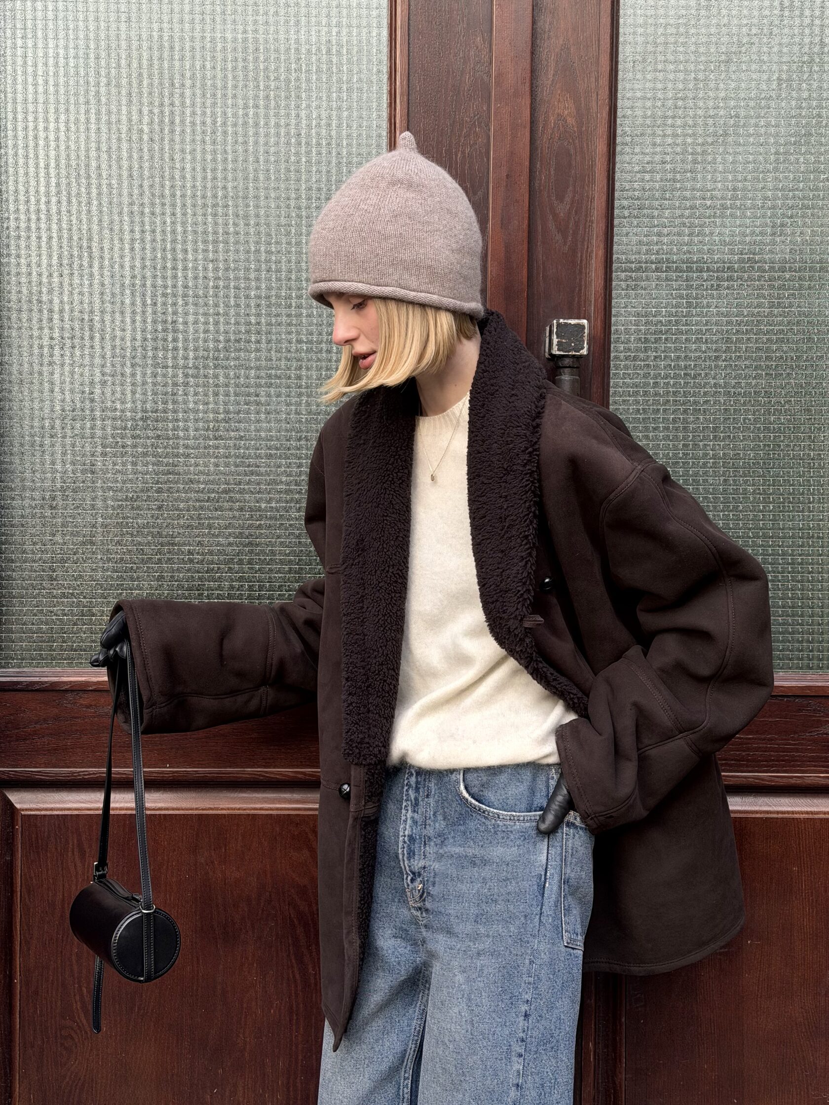 Дубленка из натуральной овчины. Благодаря удлиненному силуэту и сочетанию овчины и замши, а также оттенка, который был особенно популярен в 90’е, дубленка имеет особый ретро-шарм. Застегивается изделие на пуговицы, выполненные из натуральной кожи.
