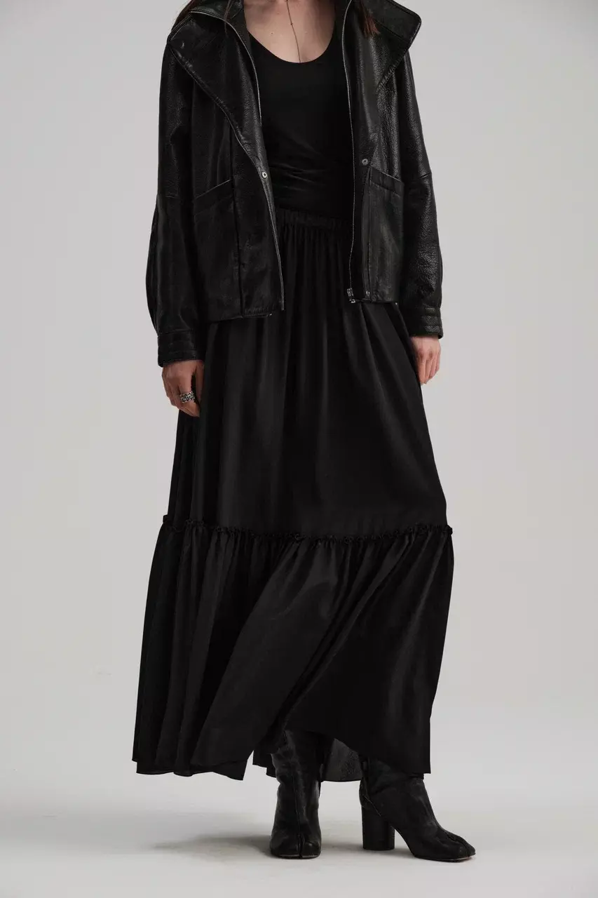 Макси-юбка из нежного матового шелка сочетает в себе комфорт и изящество. Легкий клёш и двухъярусный крой со сборкой создают воздушный, плавный силуэт, а пояс на резинке обеспечивает удобную посадку без застёжек. Функциональные карманы, выполненные из натурального шелка, делают модель не только стильной, но и практичной.