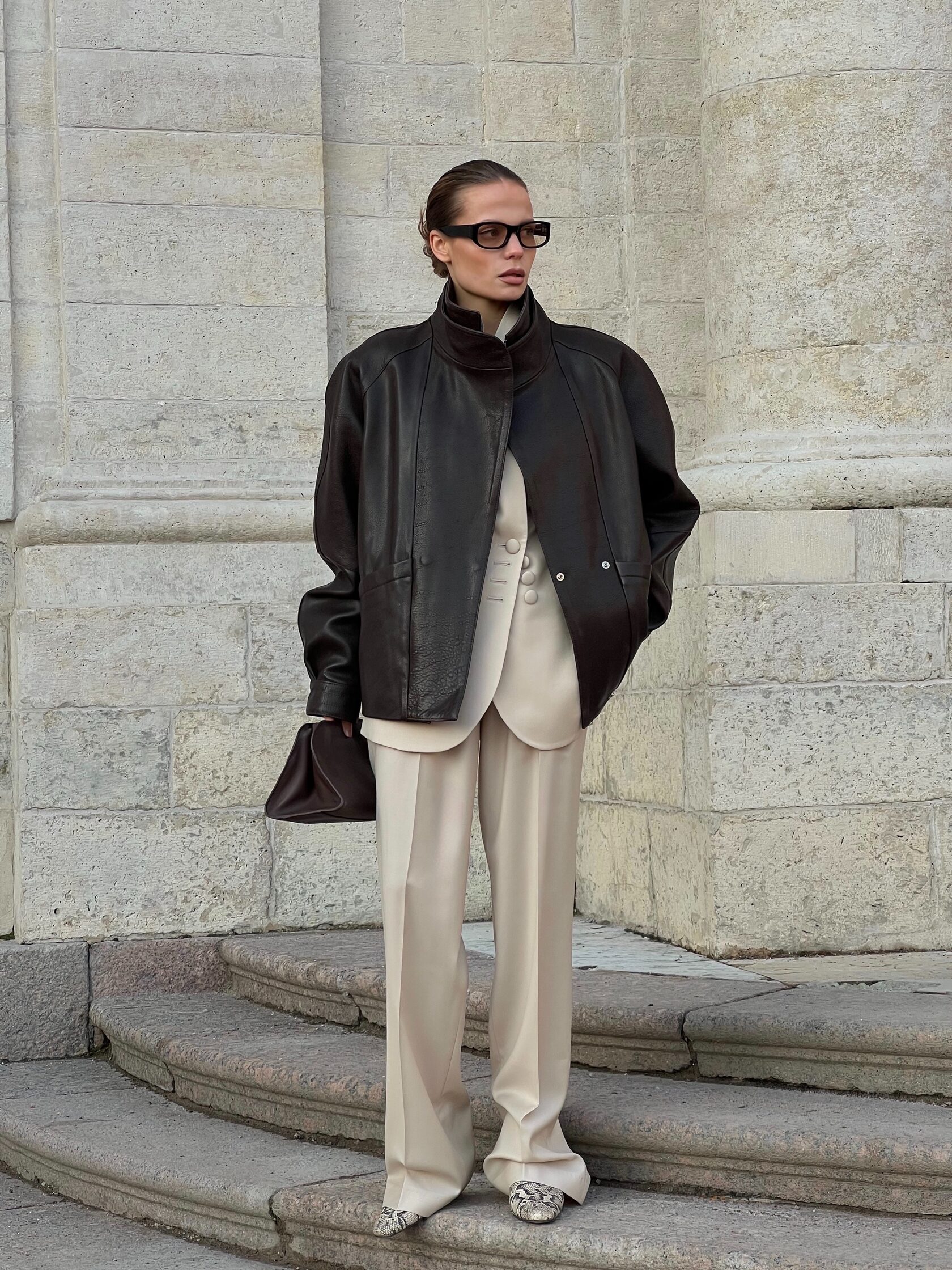 Модель выполнена из плотной костюмной шерсти светлого бежевого оттенка. Пластичная фактура мягко держит форму и подчёркивает чистоту силуэта — сдержанную, спокойную, вне времени. Внутри аффирмация: "Ощущаю свое сияние".